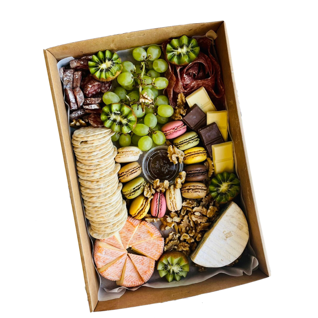 Kätevät Miniboxit! Jokainen boxi sisältää briejuustoa, vuohenjuustoa, suolakeksejä, viinirypäleitä, macaronseja, salamia, viikunahilloa ja kausimarjoja.